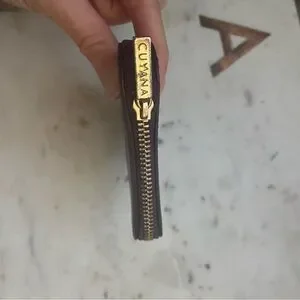 Triangular leather coin pouch. zip closure. The “Cuyana” gold hardware tag shows signs of wear.