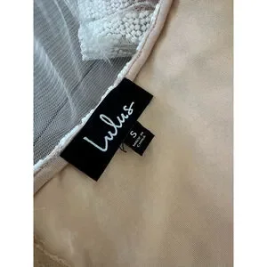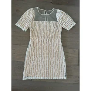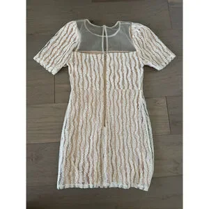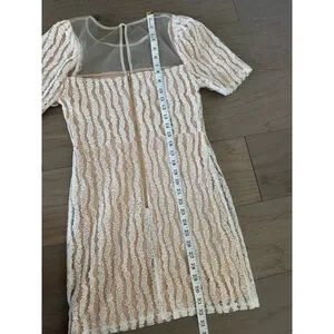 This is a pre-owned Lulus dress in size small. It features a square neckline with a sheer mesh yoke and short sleeves. The dress has a beige lining with a white textured overlay. It measures approximately 33 inches in length and 14 inches across the chest, with a zipper closure on the back.