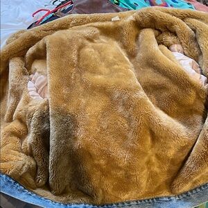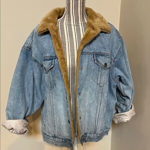 Levi's denim jacket in light blue. Features a soft brown collar. Stylish and comfortable.