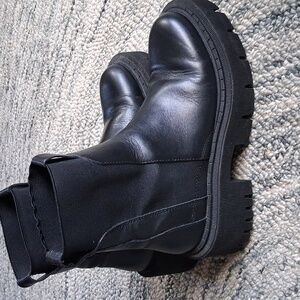 Genuine leather chelsea boots from Zara. Size 38, I'm a true 7.5 and these fit in length. Narrow fit throughout the shoe. Pull tabs make it easy to put these on. Lightweight foam soles make these very comfortable compared to other flatform boots.