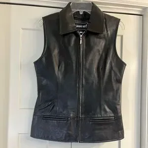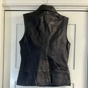 Upgrade your wardrobe with this sleek black leather vest. Perfect for adding a touch of elegance to any ensemble.