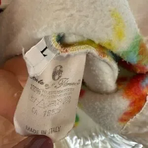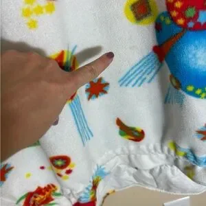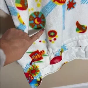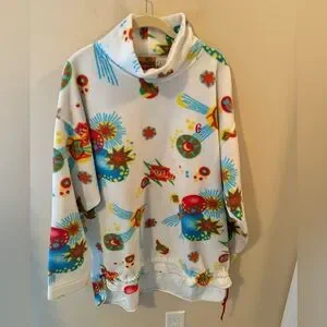 Amazing vintage fleece! This has NO odor to it and is an overall good condition, but there is a lot of random stains which I have pointed out. Still fabulous and such a unique and fun print!