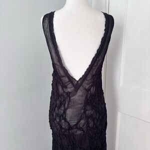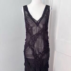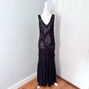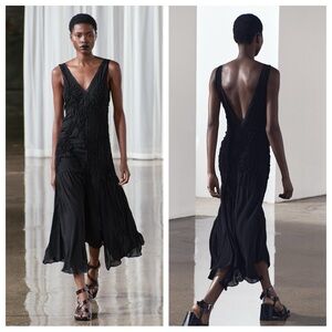 Elegant black midi dress. Features intricate detailing. Sleeveless with a deep V-neck. Flowy hem for added movement. Great condition, I just wish it was the white version for me personally!