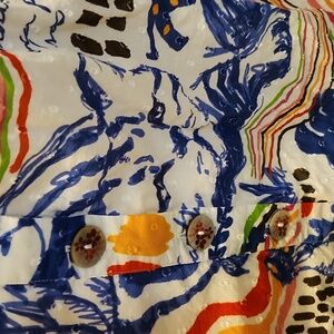 Farm Rio size small dress, very tropical. It buttons all the way down the front has writing on it, A tiger and very colorful a scalloped applique hemline. It is in very good condition