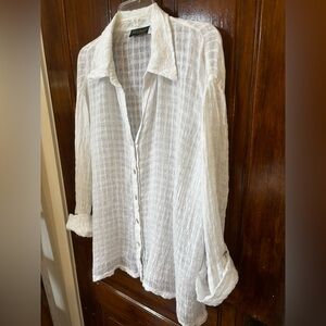 Elegant cream linen shirt with a subtle textured pattern. Ideal for versatile styling.