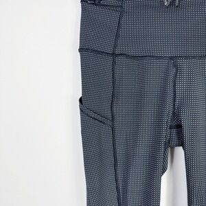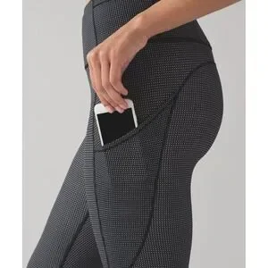 *Features: High rise, 25" inseam, Teeny Check Print White Black (black white and gray small checked pattern), compression Nulux fabric. Added Lycra for shape retention, waistband pocket, Drop-in pockets, continuous drawcord waistband. Sweat-wicking, lightweight. Reflective dots on calves