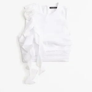 Chic white blouse with elegant ruffle design. Sleeveless and stylish.