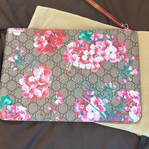 Elegant pouch with pink and red floral design. Iconic monogram pattern.