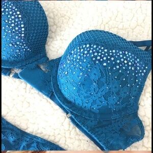 Victoria's Secret very sexy rhinestoneTeal Lace push-up Bra and Garter 38D M/L