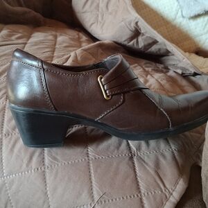 Elegant brown leather shoes. Features a stylish buckle. Comfortable heel for everyday wear.