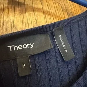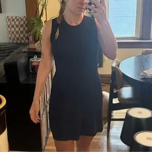 This chic black mini dress by Theory features a sleek sheath silhouette with a sleeveless halter neckline, perfect for casual outings. Its minimalist design and form-fitting style make it a versatile addition to any wardrobe.
