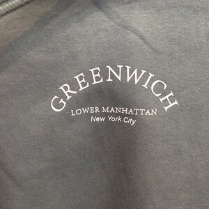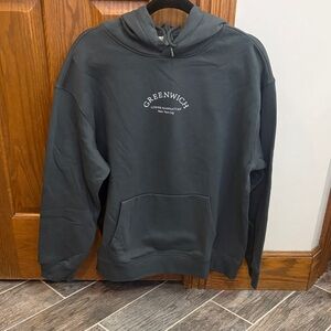 NWOT dark gray graphic print hoodie…white “Greenwich” print on the front…kangaroo pocket…medium