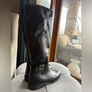 Step out in style with these sleek black leather knee-high boots. Perfect for any occasion, they offer both comfort and elegance.