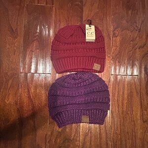 Stylish CC beanie set Includes a warm burgundy and a vibrant purple hat. Perfect for adding style to any outfit. NWT knit/stretch/vibrant/classic/chic