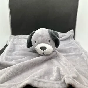 Charming gray dog plush blanket smoother. Soft and cuddly for kids.