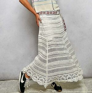 This openwork crochet knit maxi skirt features an elongated silhouette built from layered openwork construction that emphasizes handcrafted texture, breathability, and movement. The knit structure creates visual depth through alternating open and dense sections, allowing light to pass through while maintaining a substantial, artisanal feel. A relaxed drape enhances flow and dimension, reinforcing the natural movement of the skirt as it falls to full length. The butterfly-embroidered belt introduces a decorative, functional touch, adding contrast through a handcrafted aesthetic. Crochet construction highlights traditional textile techniques and visible stitch work, aligning with craftcore values and intentional imperfection. Boho and festival influences emerge through the open structure and expressive surface detail, while vintage and retro aesthetics are reflected in the classic crochet approach. Romantic elements appear through the embroidery and fluid shape, balanced by western and alternative aesthetics created by structural openness and bold textural contrast.