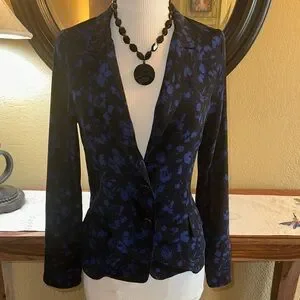This is a silk blazer in black with a blue floral pattern in a tailored fit. It has a two button closure and two working front hip pockets. So soft, you could wear it with a bralette or corset or in the more common way, over a top with trousers or a skirt. It measures 19” across the bust lying flat and it’s 22” long. Beautiful.