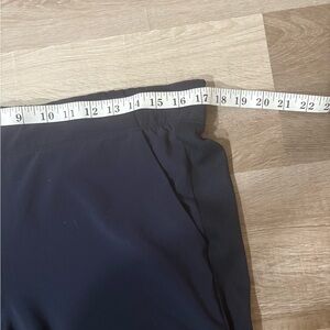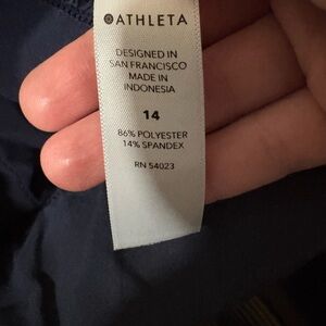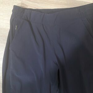 Athleta Brooklyn Jogger pants in a dark navy blue color. Made from a smooth, lightweight performance stretch fabric (86% polyester, 14% spandex) that’s comfortable and easy to wear. Designed with an elastic waistband, tapered jogger leg, and ribbed ankle cuffs for a flattering fit. Features zippered side pocket and back pockets, making them perfect for travel, athleisure, or everyday wear.