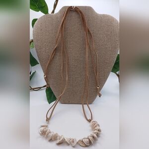 This Free People necklace features a stunning array of tan, shell-like beads that exude a bohemian charm. The irregular shapes of the beads lend an organic, handcrafted feel, making it a unique addition to any jewelry collection. Strung on a light brown suede cord, this piece is perfect for those who appreciate natural elegance.