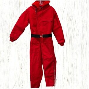 * One-piece nylon canvas ski suit, thick quilted inner lining, all zippers & snaps fully functional, fur-lined hood, attached webbing belt with heavy metal buckle, pockets with hook & loop closure.