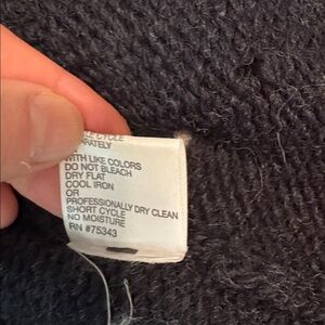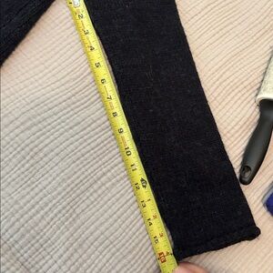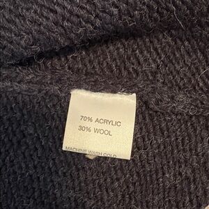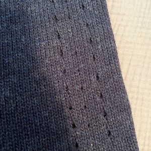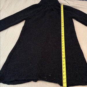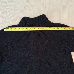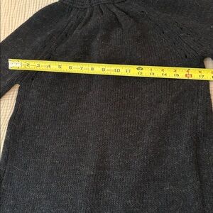 Very good pre-owned condition. I would say fits more like a Medium in the shoulders. Great Length. Light fuzzing. Fun cutout patterns at hem and shoulders and front.