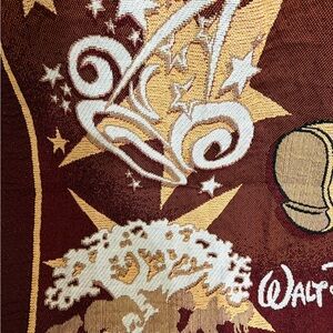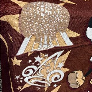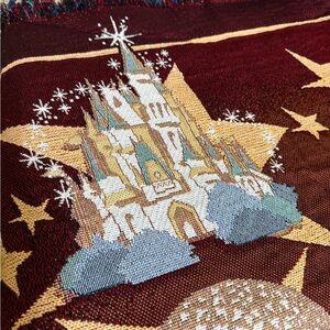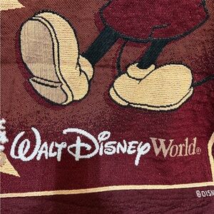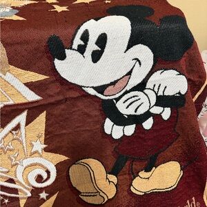 Cozy Disney throw with Mickey Mouse design. Features maroon and black colors with iconic Disney World elements.
