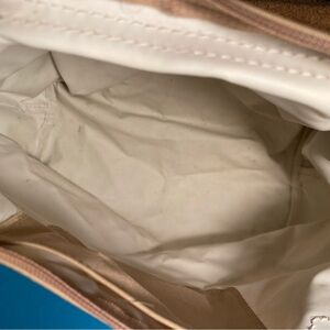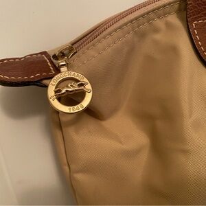 Chic Longchamp tote in tan with brown leather trim. Ideal for daily use. It is approx 9" x 10" & 5" deep. It does have a couple of spots see pics. The corners are worn some see pics.