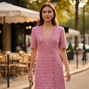 This chic London Times dress in size 12 features a classic, polished look with a flattering silhouette. Designed in a stylish pink-and-white houndstooth pattern, it includes a V‑neckline, short sleeves, and decorative front buttons that add a refined, tailored touch. The dress closes with a back zip closure for easy wear and a smooth fit.