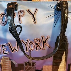 Coach Poppy NYC Destination Ombre Blue Satin Leather Skyline Glam Tote Bag, a limited edition and now discontinued item. The bag features a New York City skyline made of mixed leathers and fabrics, with "POPPY" and "NEW YORK" text.