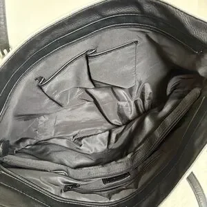 Gorgeous faux leather bag in a very pale gray with a hint of blue. Straps and interior are black. Hardware is silver tone.