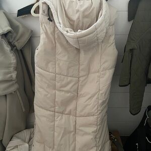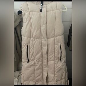 Chic hooded puffer vest by Avec Les Filles. Buff color adds elegance. Ideal for layering.
