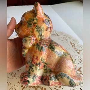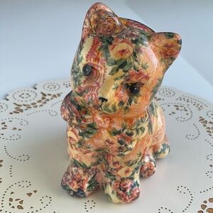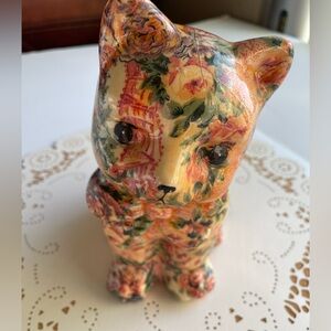 Delightful handmade decoupage cat figurine adorned with a floral pattern. Has crazing throughout but does not affect overall design. Typical for vintage piece. See photos.