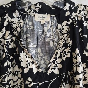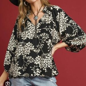 Umgee Black Floral Cherry Blossom Print Scalloped Hem Blouse Large V-neck