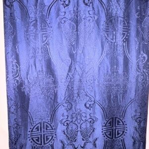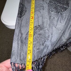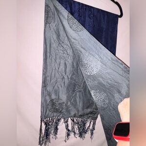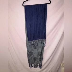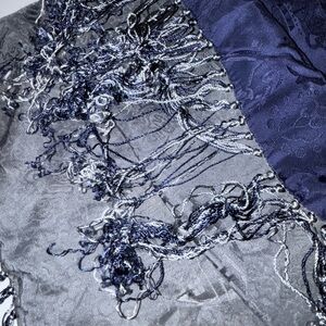 Elegant blue and gray scarf featuring intricate patterns and fringe detailing. A versatile accessory for any wardrobe.