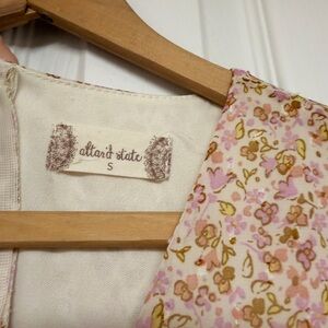 Soft, romantic Altar’d State dress in a light blush pink with an allover delicate floral print. Features a flattering V-neckline, short flutter sleeves, and a wrap-style skirt with tiered ruffle detailing for easy movement and feminine flow. Fully lined for comfort and coverage, with a concealed back zipper that works perfectly. Excellent used condition, from a smoke free home.