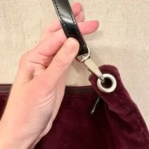 The photos make this look burgundy, but it is closer to a plum colored velvet. Excellent way to class up your daily wear with some dramatic color, and a wonderful texture. I just like touching this because its soft, but still holds everything I need when I go out.