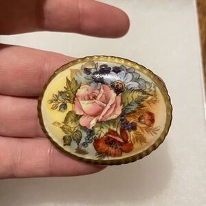 This is a beautiful, rare and highly collectible Aynsley fine bone china brooch. It has a floral design and is signed J.A. Bailey, who was one of the company's most famous painters from the 1930s to the 1970s. It was made in the UK in the 1970s. The brooch measures 2 inches by about 1.5 inches and is in great condition.