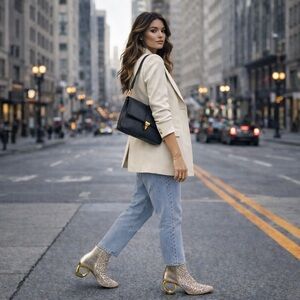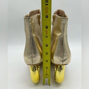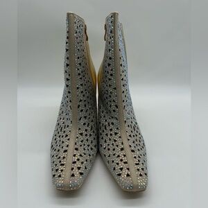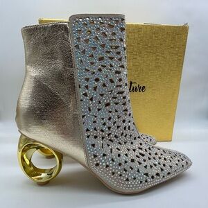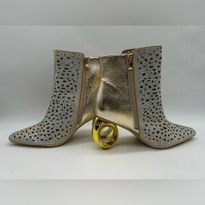 Lady Couture Breeze ankle booties in stunning gold featuring an elegant rhinestone cutout lattice upper and a bold architectural sculpted heel. The intricate openwork design adds sparkle while keeping the look airy, modern, and fashion-forward. Brand new in box and never worn.