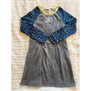 Matilda Jane 435 long sleeve dress combines comfort and playful style with a raglan-sleeve design. The heathered grey bodice features a soft fleece-like interior and functional side pockets with pleated detailing, while the navy blue sleeves are adorned with a colorful polka dot print. A bright yellow trim at the neckline adds a pop of contrast to this versatile piece, which is finished with the signature flower logo button near the hem.