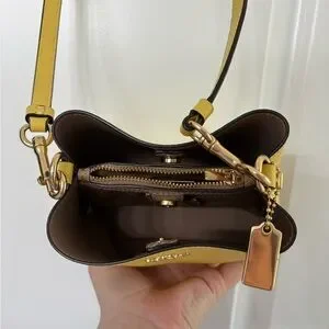 Only used once! The Coach Mini Town Bucket Bag is made from genuine leather and features a center zip compartment. It has snap closures and a detachable strap that can be worn over the shoulder or crossbody.