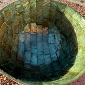 Beautiful mother of pearl green bowl. In great used condition. Measures 5 inches across & 3 inches tall.