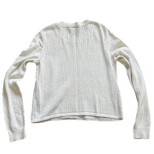 This white crew neck sweater from rag & bone features an open knit texture, offering a relaxed fit perfect for everyday wear. The long sleeves and ribbed cuffs add a touch of classic style, while the cropped length provides a modern twist. Ideal for layering or wearing on its own, this versatile piece is a must-have for any wardrobe. Soft white. Great condition.