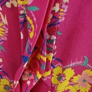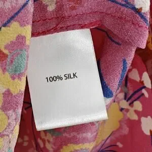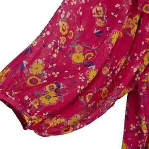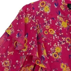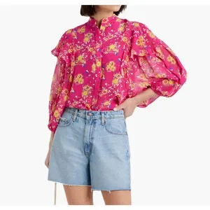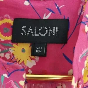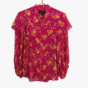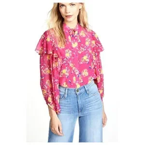 Saloni Chloe floral top in women's size 4. Pink with multicolor floral print 100% silk chiffon. Button front. Concealed button placket. Ruffles at the shoulders. 3/4 length sleeves. Some small spots on the button placket. Not too noticeable due to the print. See photo.
