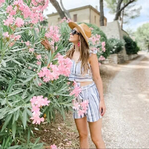 Striped crop top with elastic back and adjustable straps. Paper bag shorts in another listing. Bought two sizes. Typically I wear a size S and this was a tad big on me- didn’t need the elastic backing to stretch at all so I’d say it fits true to size.