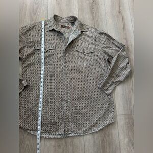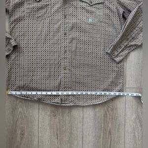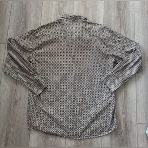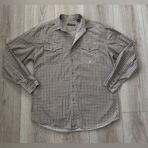 Roper shirt with intricate geometric design. Features brown and white colors. Perfect for casual wear.