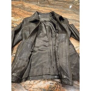 Stylish dark olive green/brown leather jacket. Features front zipper and side pockets. Perfect for any occasion.