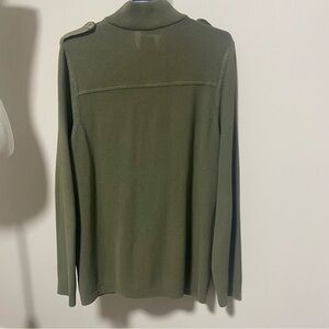 Cotton cardigan with military style epaulets and pockets. Zipper front. Basket stitch knit with ribbed cuffs and collar.
