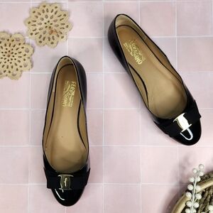 A glammed up version of the refined ballet flat in smooth patent leather. The sleek black makes this the perfect shoe for elegant looks or to add a rock touch to daywear. The grosgrain bow with silver metal plate and engraved logo decorates the rounded tip.