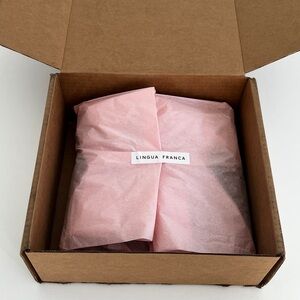 Lingua Franca’s classic cashmere crewneck with “give a damn” script embroidered. New with tags and original packaging. Removed only for photos.