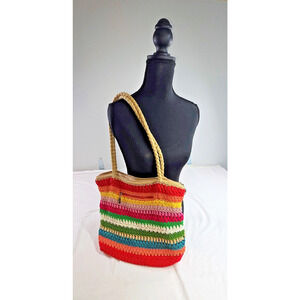 The Sak Crochet Rainbow Striped Tote Bag Rope Handle Lined Boho Shoulder